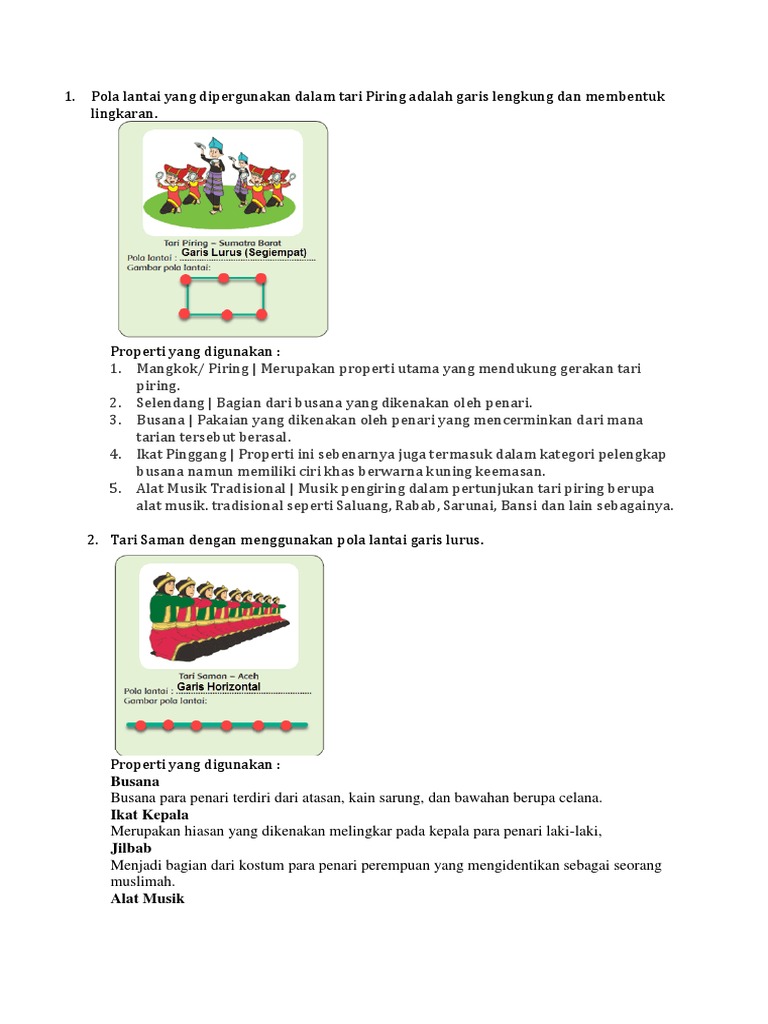 Dec 05, 2019 · d. Pola lantai adalah garis imajiner yang dilalui penari saat melakukan gerak tari 9. Level dalam gerak tari adalah adalah tinggi rendahnya gerak tari yang dilakukan. Gerak tari berdasarkan level memiliki tiga elemen yaitu rendah, sedang dan tinggi. Jan 27, 2021 · contoh tarian daerah yang menggunakan pola lantai garis lengkung adalah tari kecak dari bali, tari sekapur sirih dari jambi, tari pendet dari bali, tari seudati dari aceh, tari badong dari sulawesi selatan, tari gawi dari flores, dan lain sebagainya. Contohnya adalah tari gambir anom, tari koncar, tari gunung sari, tari gatotkaca, tari bondan, tari gambyong, dan tari kukilo. Pola lantai tari saman adalah pola horizontal yakni berupa pola dengan garis lurus mendatar ke samping. Jenis tari ditinjau dari bentuk penyajiannya terbagi tiga kelompok, yaitu: Seni tari adalah seni yang mengekspresikan nilai batin melalui gerak yang indah dari tubuh/fisik dan mimik. Mar 30, 2021 · 3. Makna dari tarian ini menggambarkan bahwa manusia adalah makhluk sosial yang membutuhkan manusia lain. Pola lantai anda sedang mengerjakan contoh soal latihan online pat / ukk / uas seni budaya smp kelas vii (7) tahun 2021 tahun pelajaran 2020/2021. Jan 14, 2021 · sudah menjadi tugas generasi muda untuk selalu melestarikan budaya tari tradisional yang ada, agar tidak punah dan hilang.